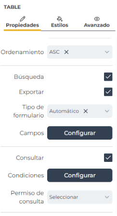 - Consultar: Cuando el usuario habilite la opción Consultar, se mostrarán propiedades adicionales para esta propiedad. Las consultas tendrán un funcionamiento similar a la modificación de registros, con la diferencia de que los valores de los registros solo estarán disponibles de forma visual, no para su modificación.