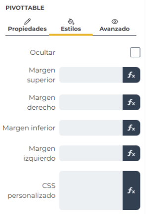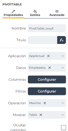 - Ocultar controles: Debido a que la tabla pivote puede mantener como disponibles, pero sin afectar al componente directamente, esta propiedad permite que, al seleccionar el check, los campos que no esten afectando al componente puedan ser ocultados.