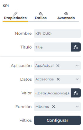 - Filtros: Al establecer condiciones para los filtros de un KPI, el usuario podrá limitar los registros que sean considerados en la función del componente.