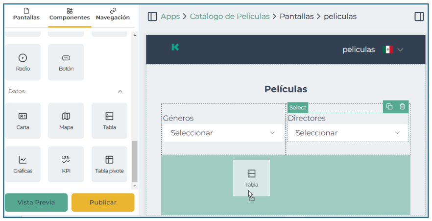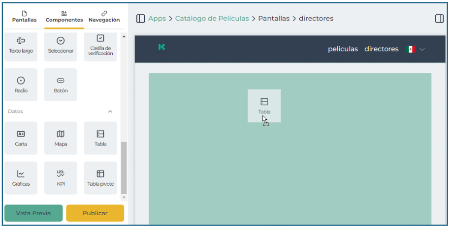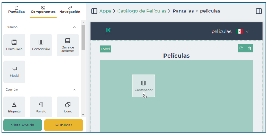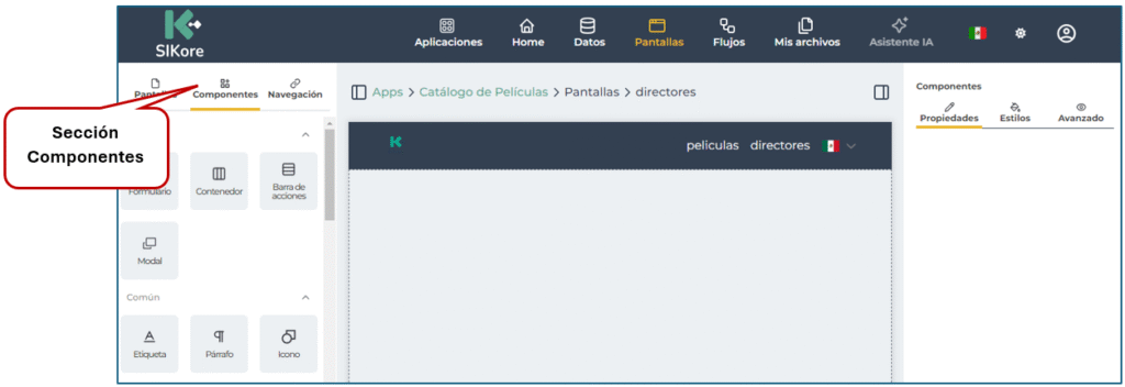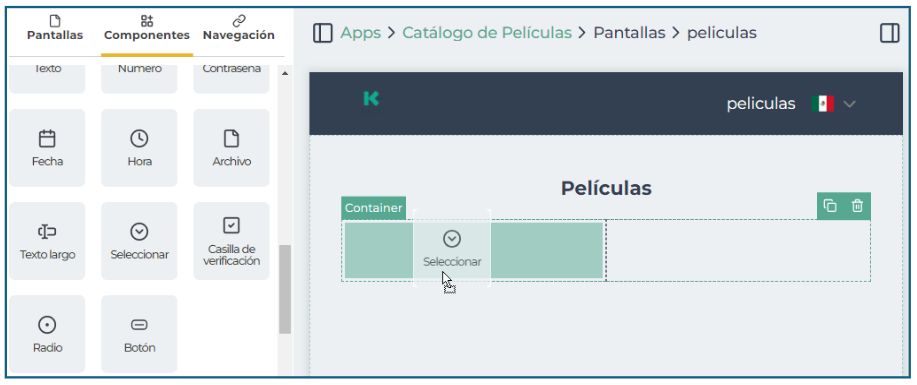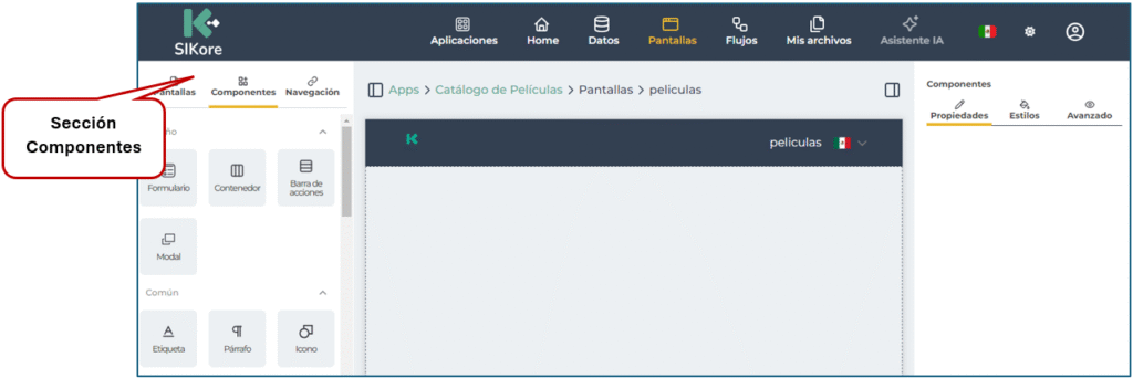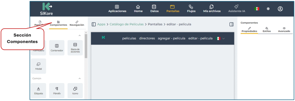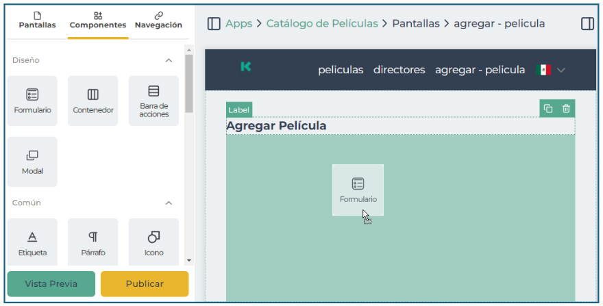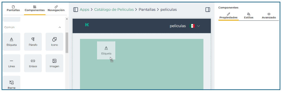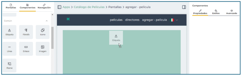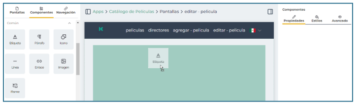 Para configurar nuestra pantalla para editar películas debemos ir a la sección componentes y así comenzar a dar una estructura visual a nuestra pantalla.