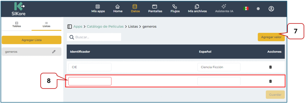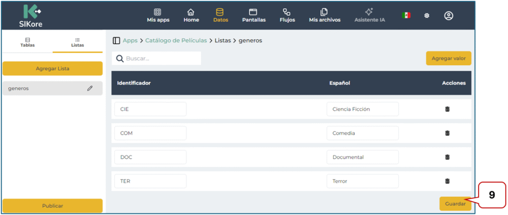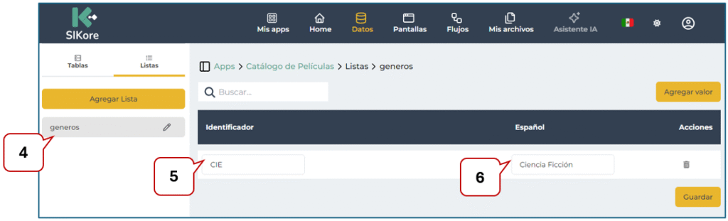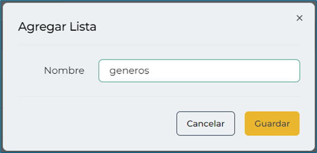 1. SIKore nos presenta campo para registrar el nombre de la lista géneros (no se permiten acentos).