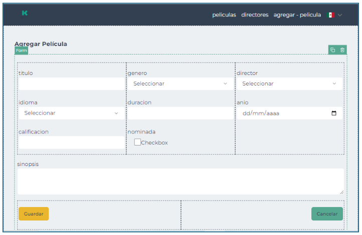 Una vez terminada nuestra pantalla de Agregar – Película así es como estaríamos viendo los campos para capturar una película: