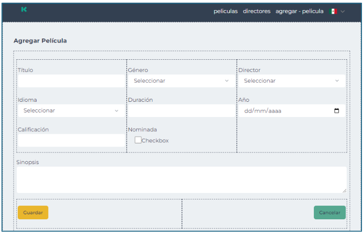 De la siguiente manera es como se estarían presentando los campos para el registro de una nueva película.