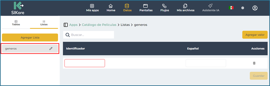 1. Seleccionamos la lista géneros para ver los campos Identificador y Español para registrar información que corresponde a géneros de películas.