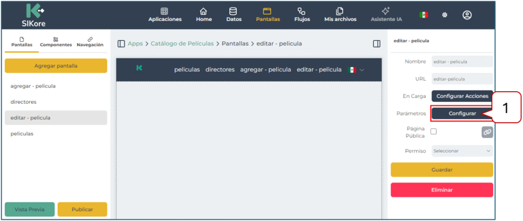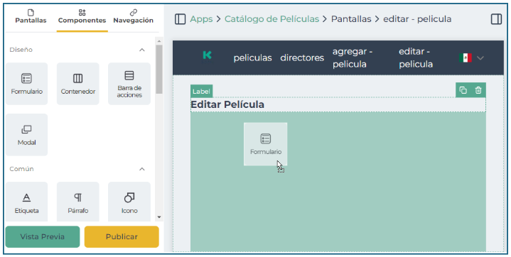 Una vez estando dentro de la sección de Pantallas crearemos la pantalla Editar Película siguiendo los siguientes pasos: