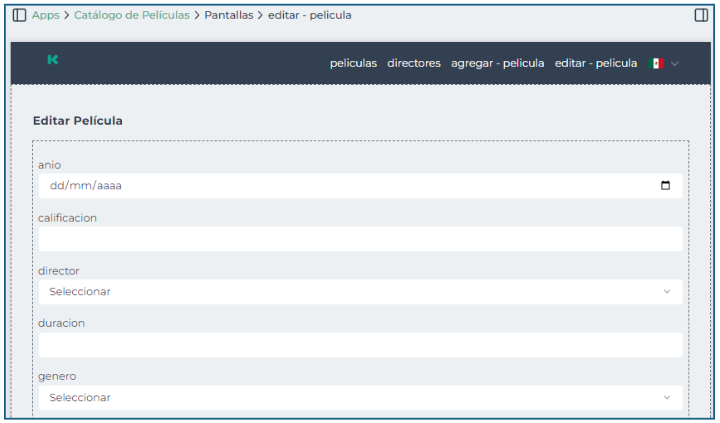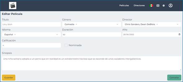 Una vez terminada nuestra pantalla de Editar – Película así es como estaríamos viendo los campos para hacer la edición de un registro de película: