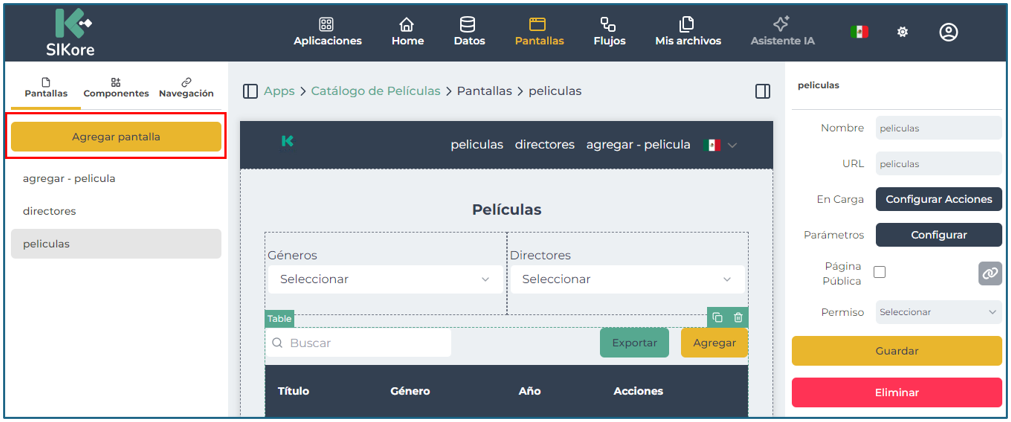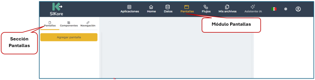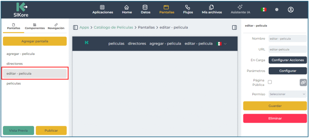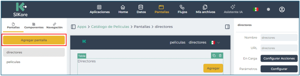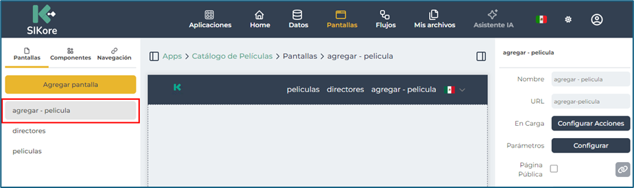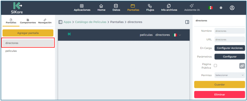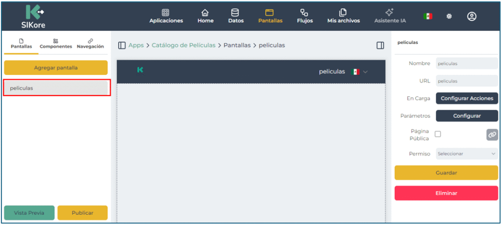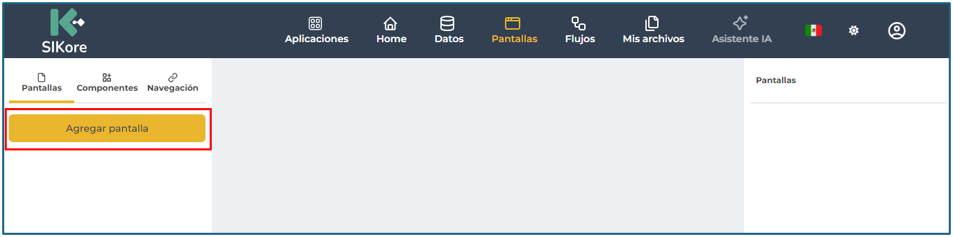 Dentro de este apartado que SIKore nos presenta de lado izquierdo cada una de las pantallas que creamos para poder gestionarlas de acuerdo con el objetivo de nuestra aplicación.