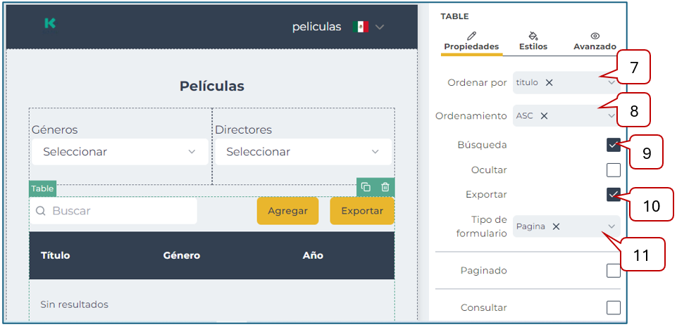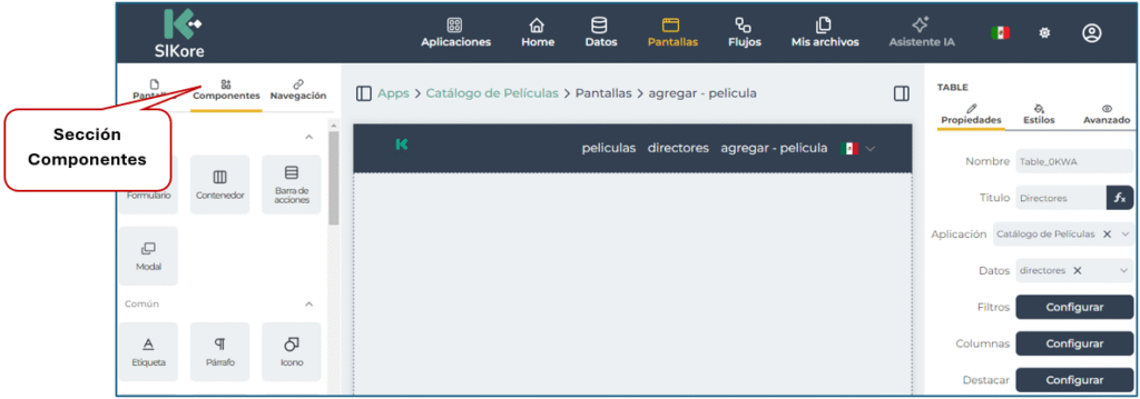 1. Damos clic sobre el componente tabla para seleccionarlo y SIKore nos presente las propiedades correspondientes a la tabla.