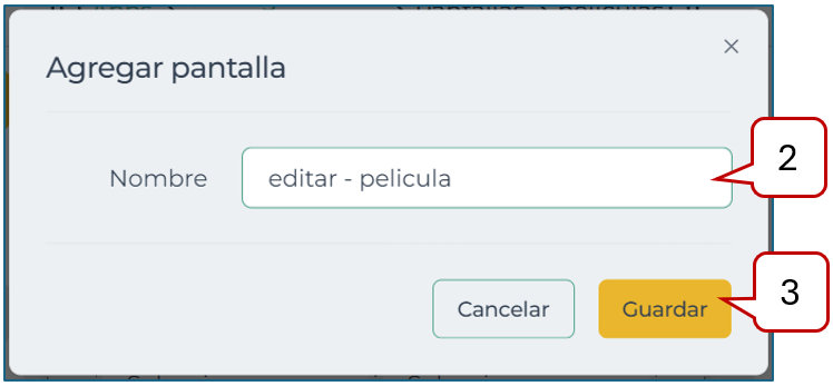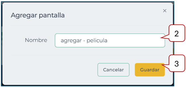 1. En el campo Pantalla para crear seleccionamos la opción “agregar – película” para indicar que esa pantalla es la que nos permitirá agregar nuevos registros de películas.