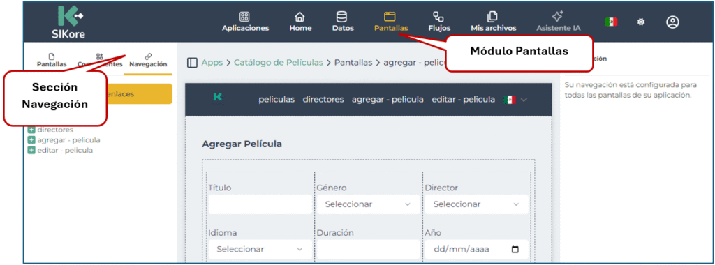 Dentro de esta sección vamos a configurar como queremos que sea la interacción entre las pantallas que usaremos para llevar a cabo el registro y control de nuestro catálogo de películas.