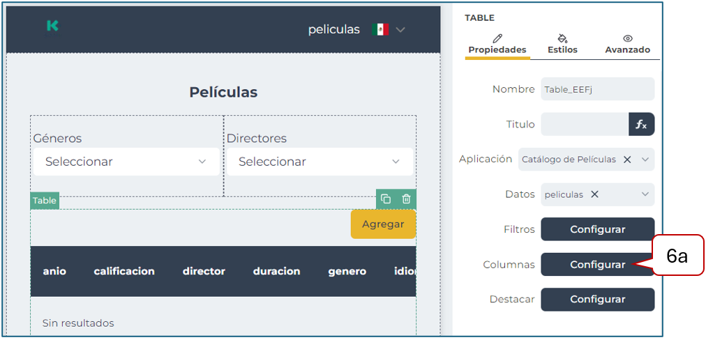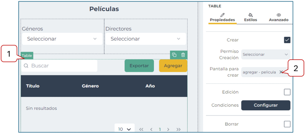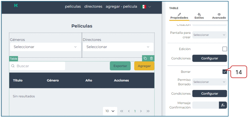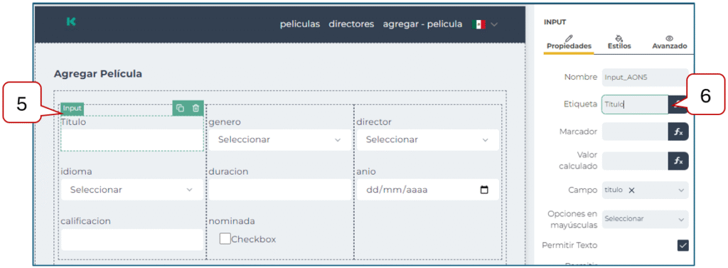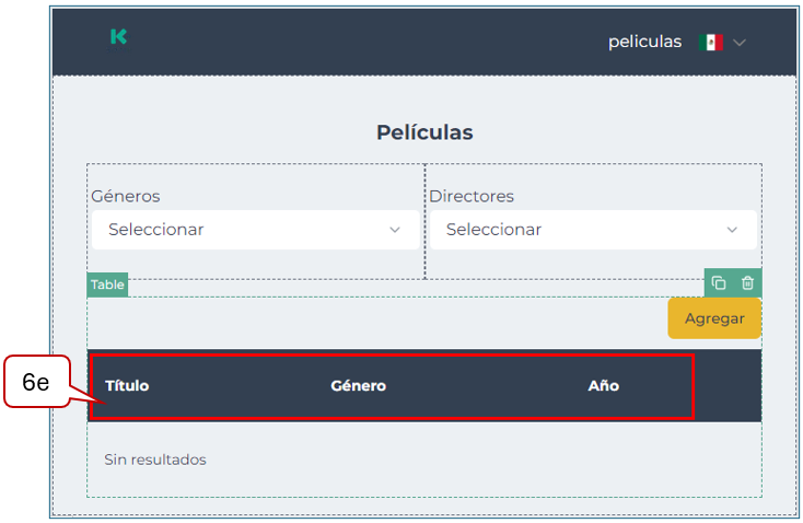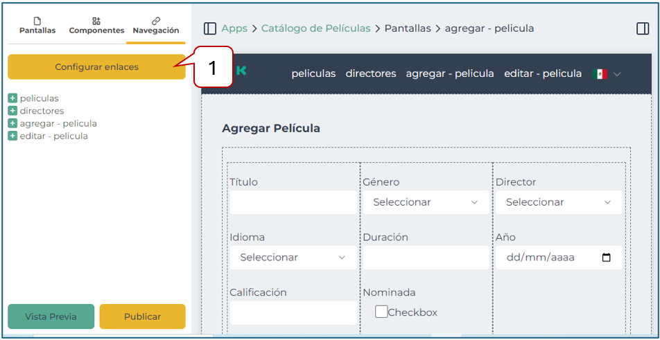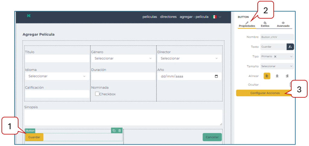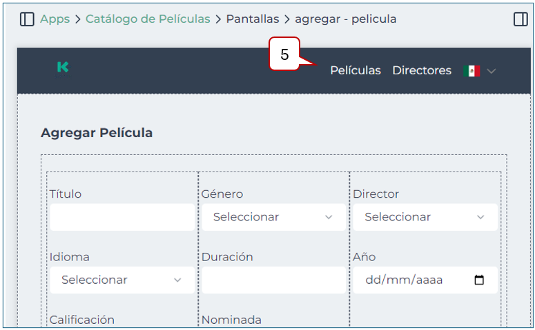 Una vez realizada la configuración de la pantalla Agregar – película, debemos ir a la pantalla Películas para relacionar la nueva pantalla de agregar con la pantalla de películas.