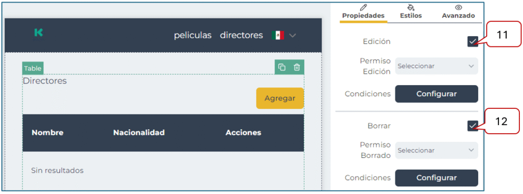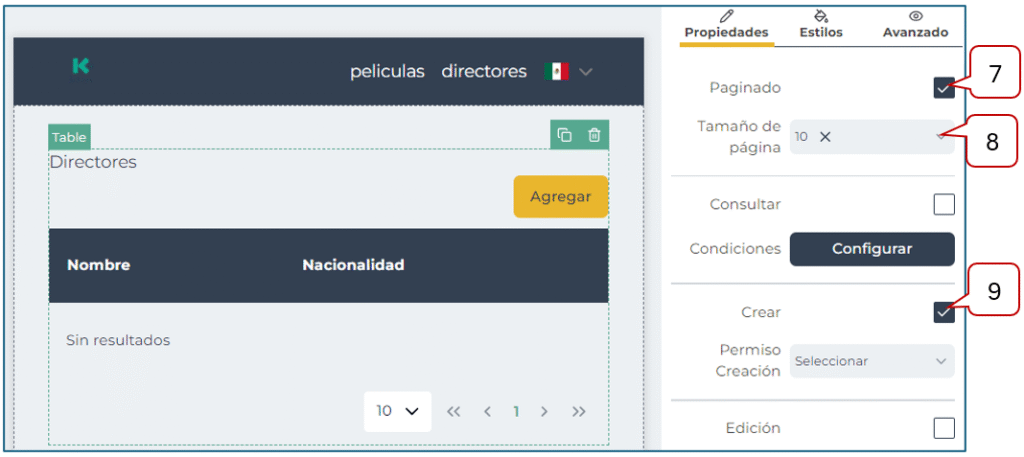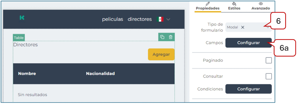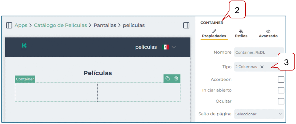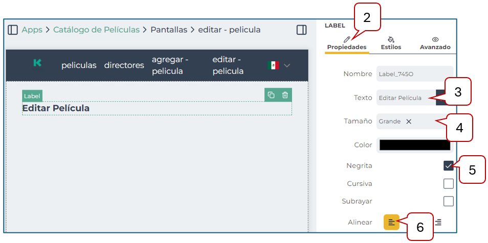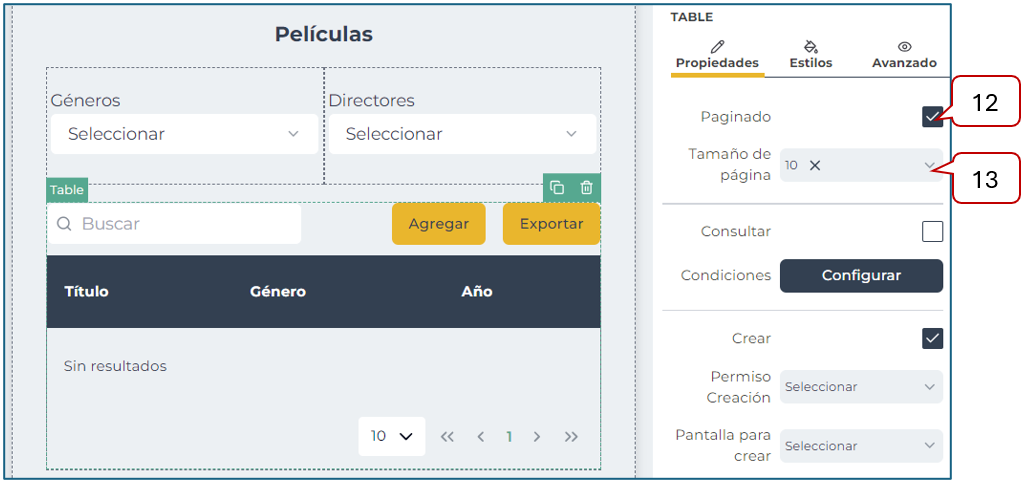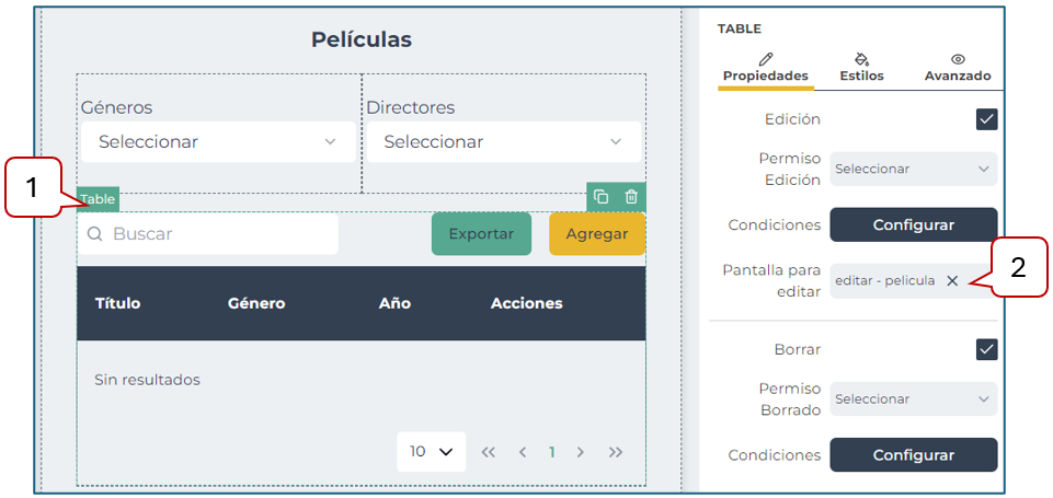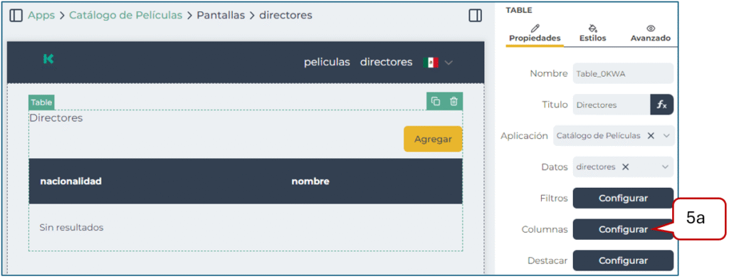 Una vez realizada la configuración de la pantalla Agregar – película, debemos ir a la pantalla Películas para relacionar la nueva pantalla de agregar con la pantalla de películas.