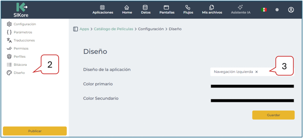 1. En campo Diseño de aplicación seleccionamos la opción Navegación izquierda para que nuestro menú se presenta de lado izquierdo de la pantalla.