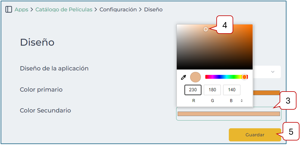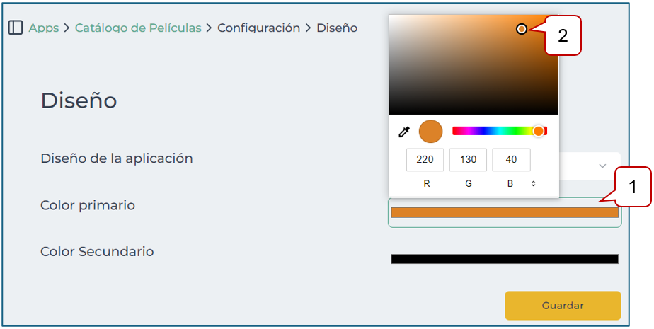 Para el cambio de colores en nuestra aplicación vemos el campo de selección Color primario para el cambio de color en los botones principales de nuestra aplicación y el campo Color secundario para el cambio de los botones que no implican un cambio dentro de nuestra aplicación como por ejemplo el botón “Cancelar”.