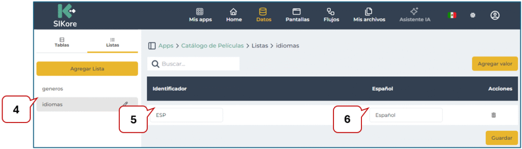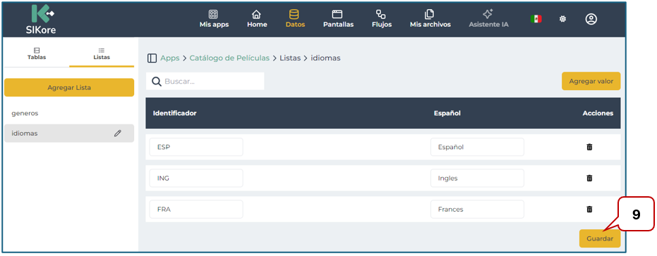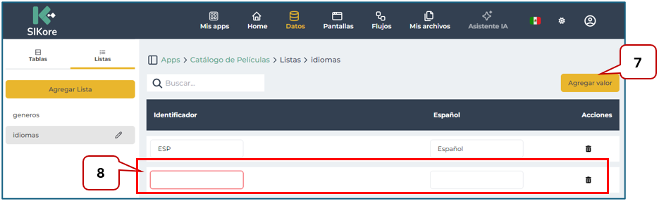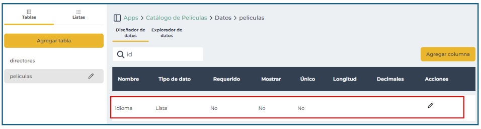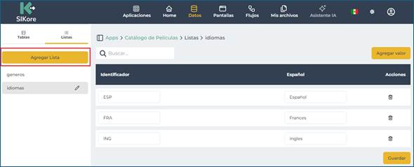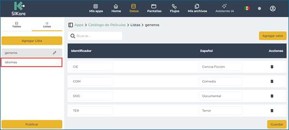 1. Seleccionamos la lista idiomas para ver los campos Identificador y Español para registrar información que corresponde a los idiomas de las películas.