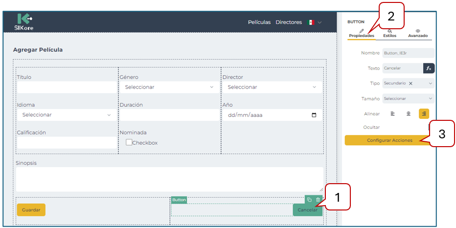 1. SIKore nos presenta de lado derecho de la pantalla las Propiedades del botón Guardar.