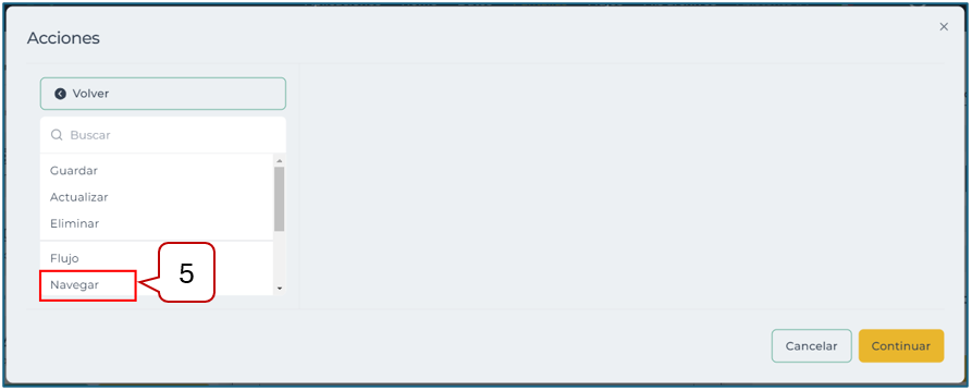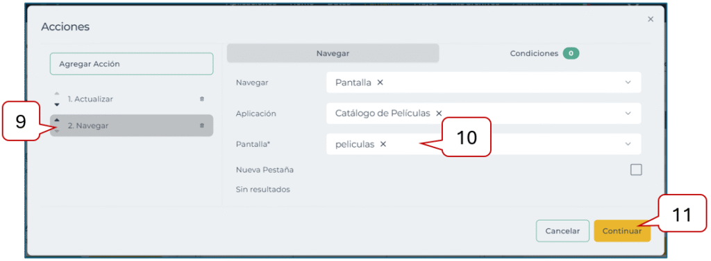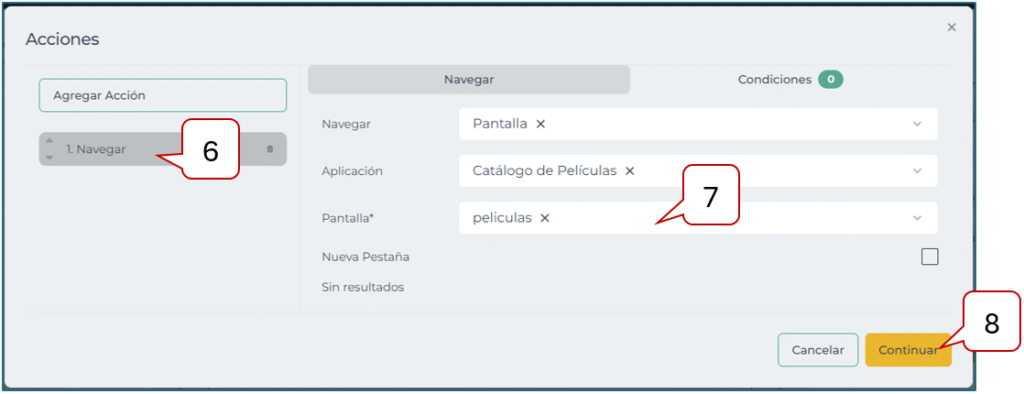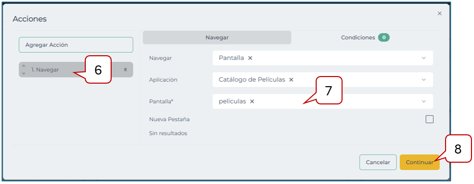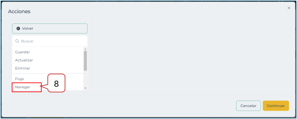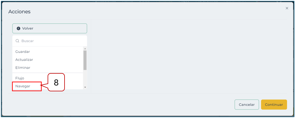 1. Damos clic en la acción Navegar previamente seleccionado para poder configurar la acción de navegar.