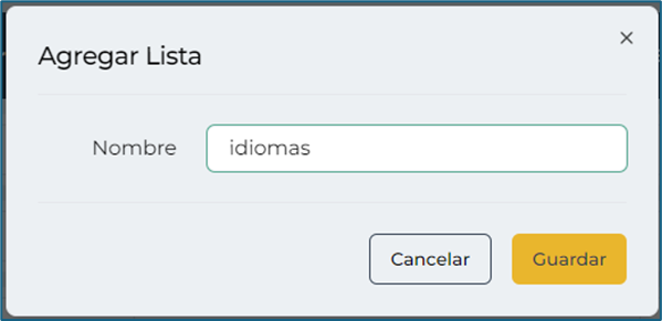 1. SIKore nos presenta campo para registrar el nombre de la lista idiomas (no se permiten acentos).