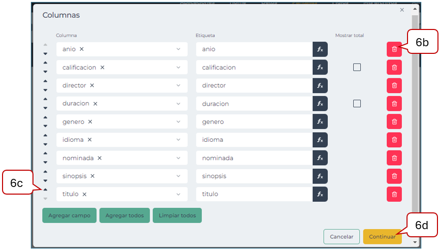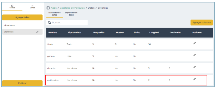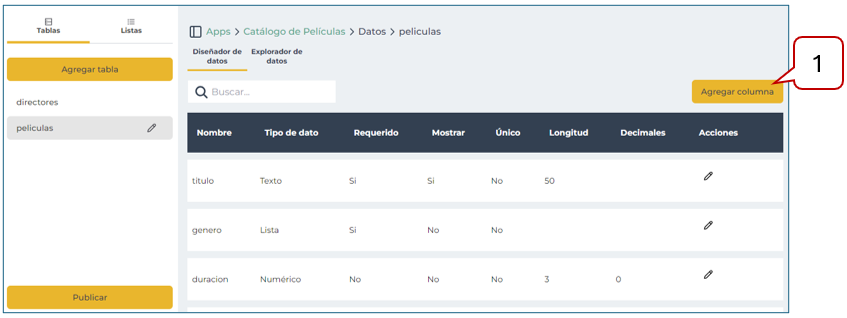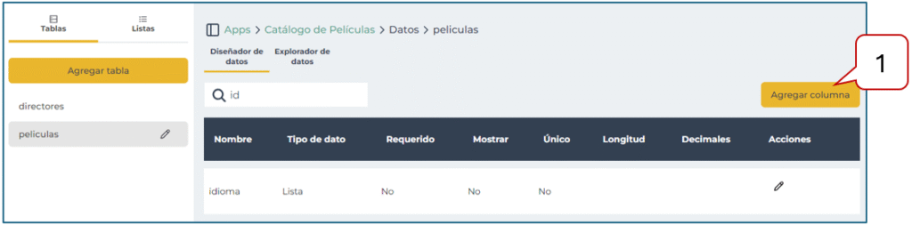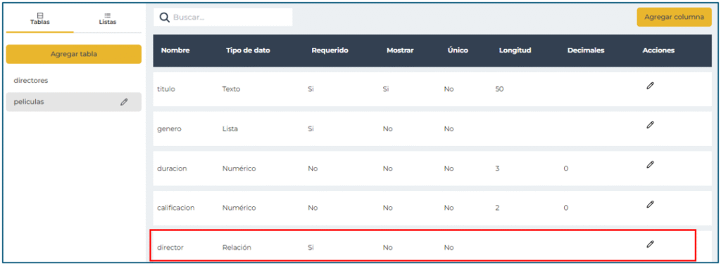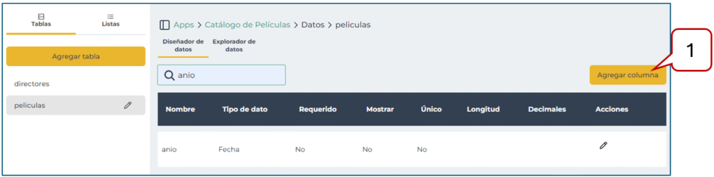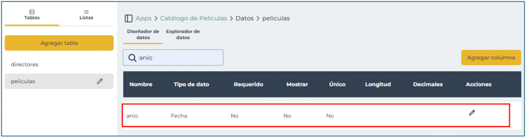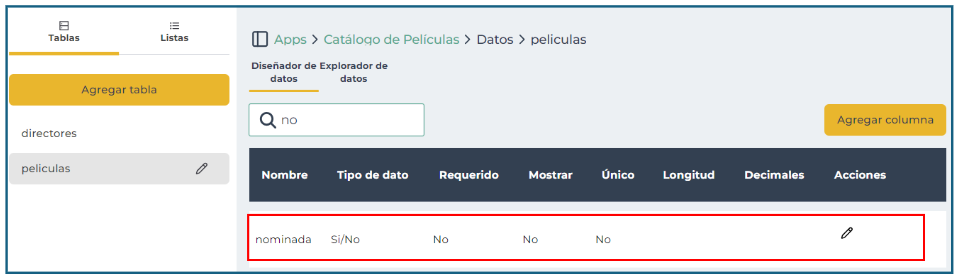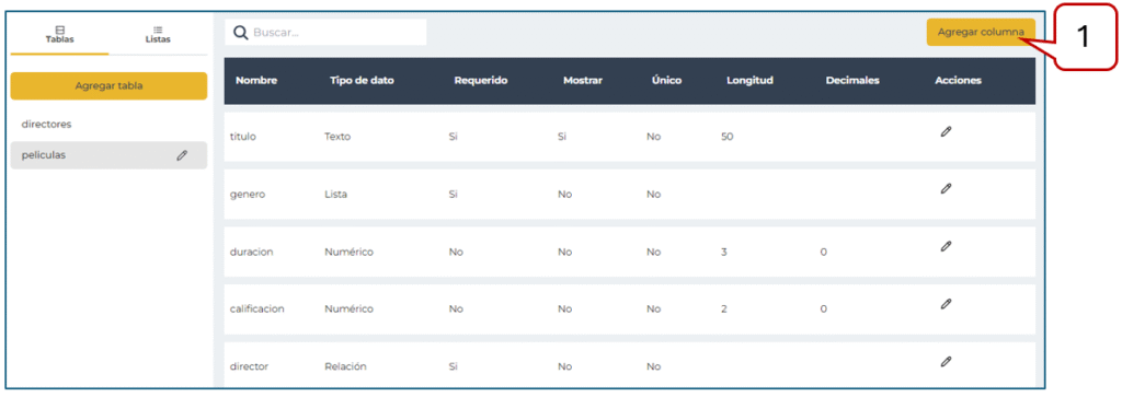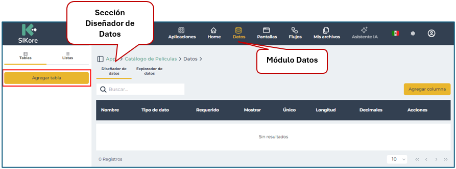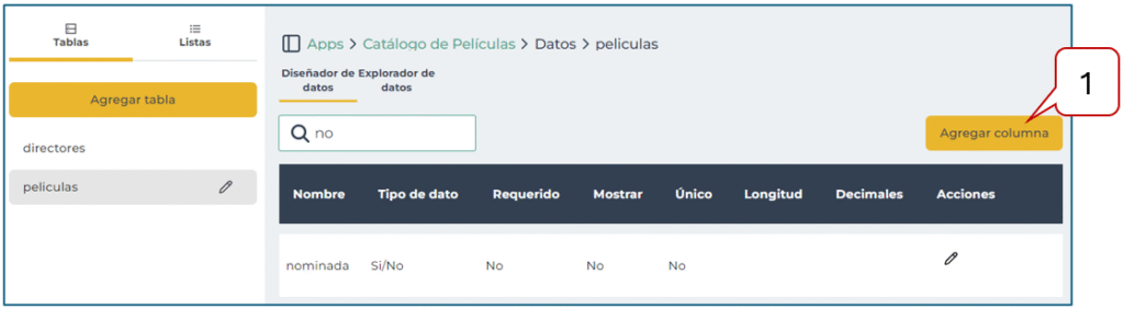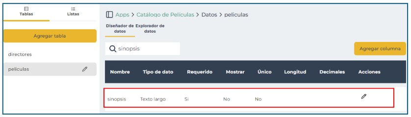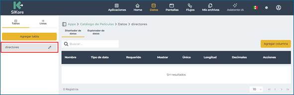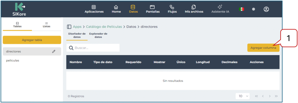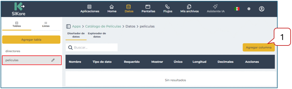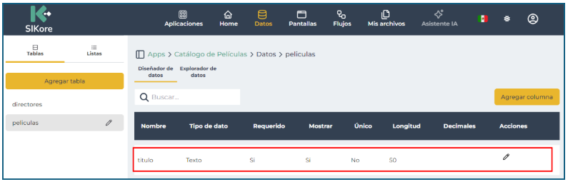 Dentro de esta misma sección SIKore nos va a permitir agregar las columnas que usaremos en nuestras tablas creadas para registrar la información de las películas.