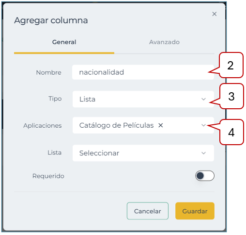 1. Seleccionamos el tipo de dato Lista para poder asignar la lista países creada previamente y relacionarla con la nacionalidad del director.
