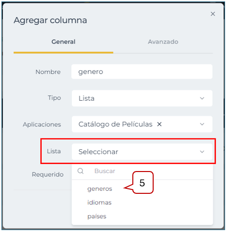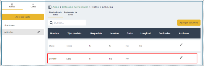 1. Seleccionamos la lista géneros creada previamente en el módulo Listas que pertenece a nuestra aplicación Catálogo de Películas