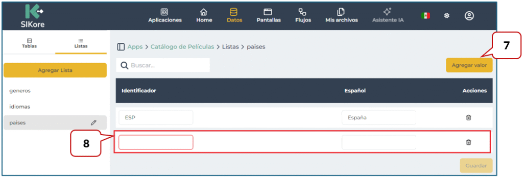 1. SIKore nos presenta campo para registrar el nombre de la lista países (no se permiten acentos).