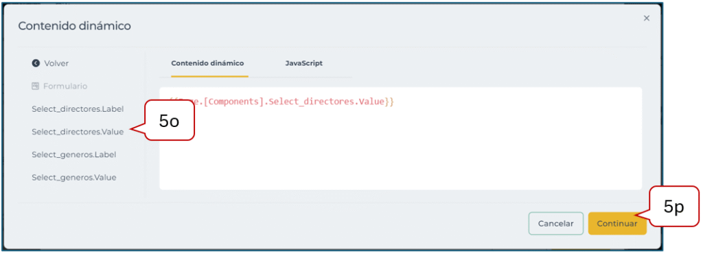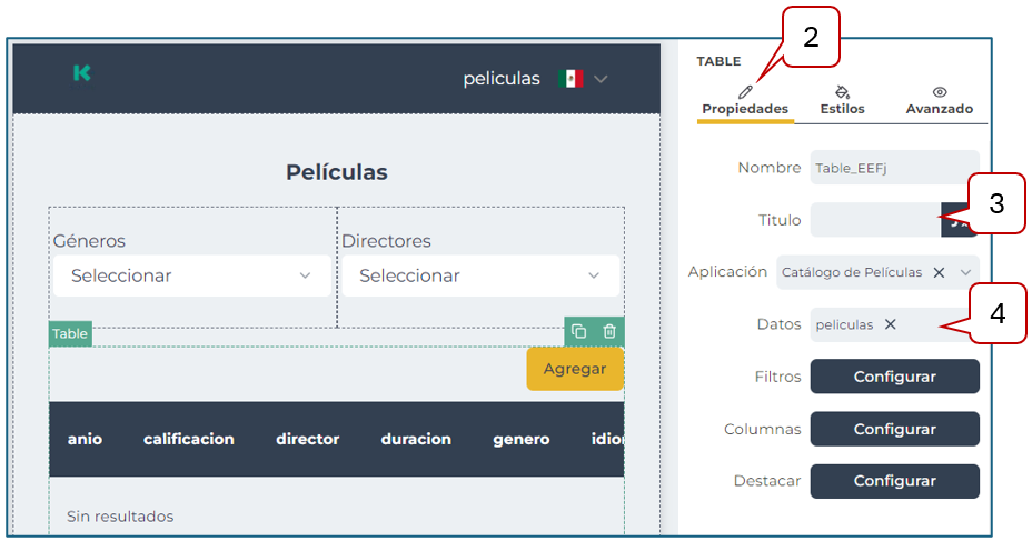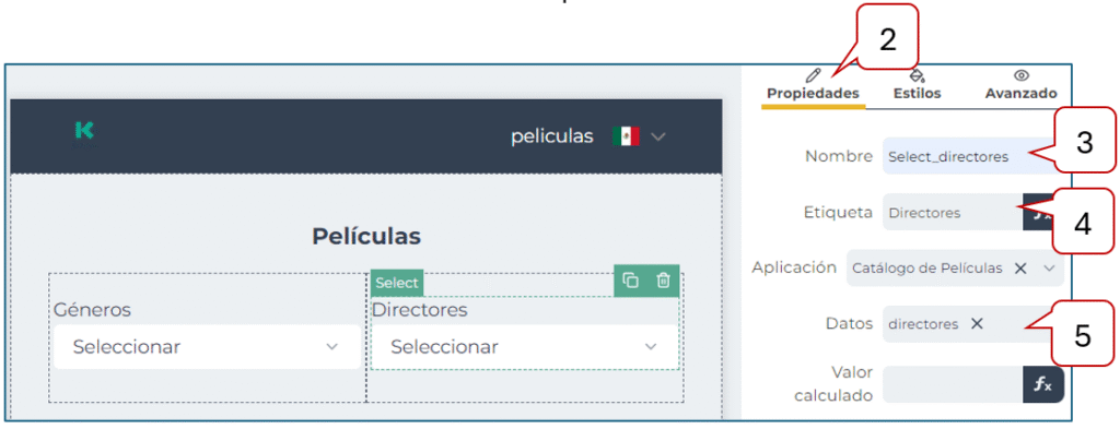 1. Seleccionamos en el campo Datos la opción “películas” indicando que son los datos que vamos a usar.
