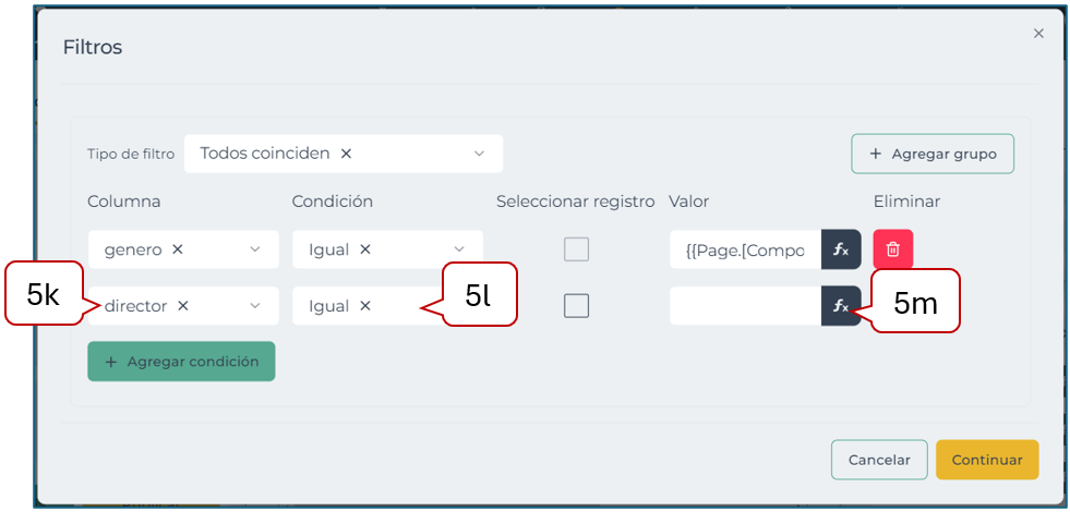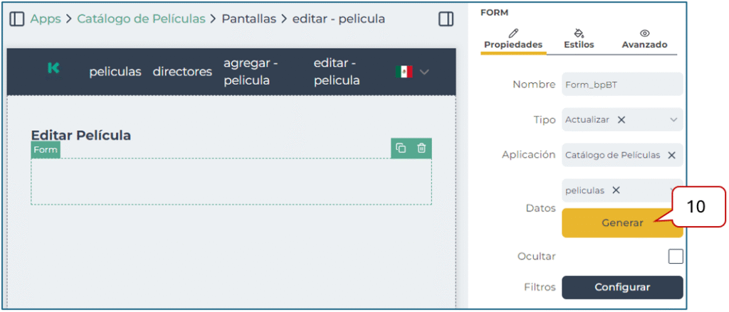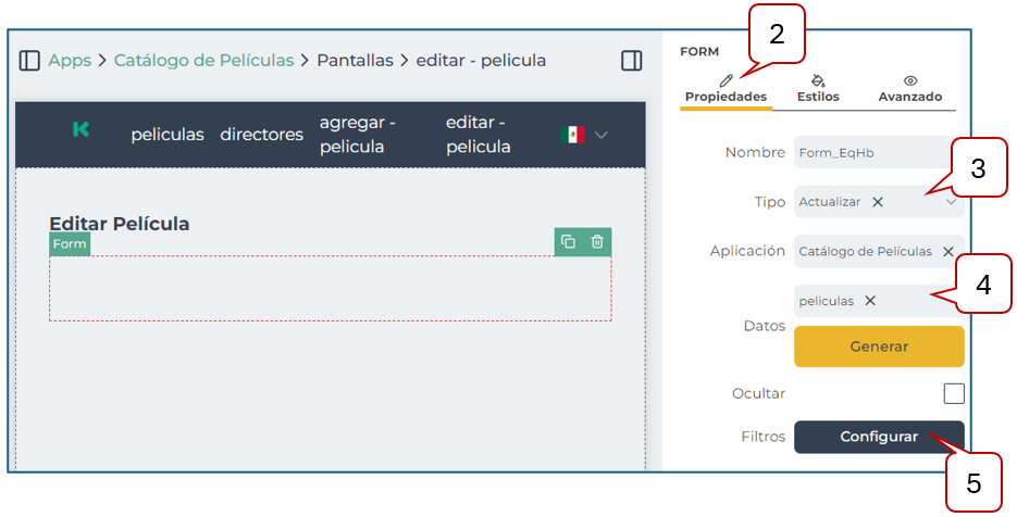1. Damos clic en botón Configurar del campo Filtros para relacionar el parámetro ID previamente configurado al crear la pantalla editar – película.