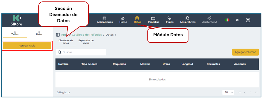Para crear nuestra tabla Películas debemos ir al módulo Datos posterior a eso a la sección Diseñador de datos.