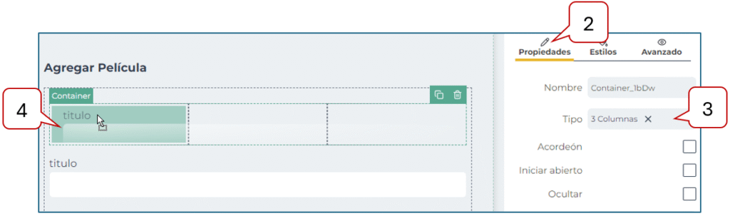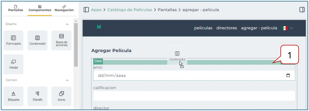 Para obtener el orden de los campos en nuestra pantalla editar – película y visualmente se presenten como en la pantalla agregar – película, debemos seguir el mismo procedimiento que se presenta en la sección Componente contenedor.