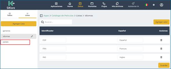 1. Seleccionamos la lista países para ver los campos Identificador y Español para registrar información que corresponde a los países de las películas.