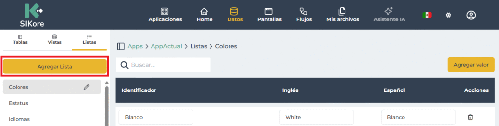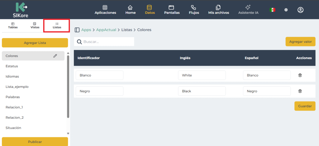 *Es importante tomar en cuenta que, si una lista está siendo usada en alguna aplicación, los elementos de la lista no podrán ser modificados debido a que alterar los valores en la lista implicaría afectar todos los apartados donde se esté utilizando.