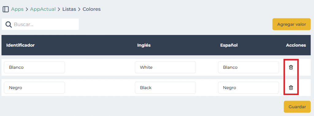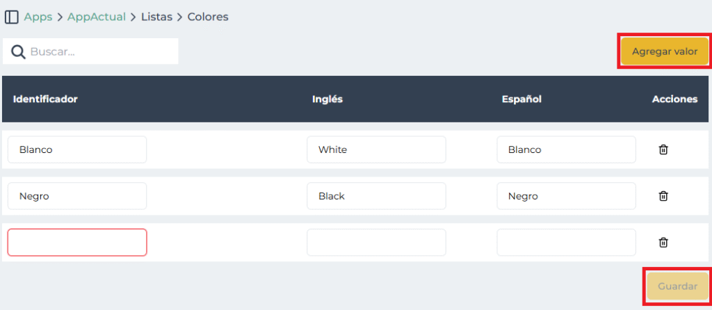 Para crear un registro en la lista, el usuario deberá seleccionar la opción “Agregar valor” en la parte superior derecha de la lista seleccionada. Esto mostrará un nuevo registro en blanco, permitiendo al usuario definir un valor para el identificador y otro valor por cada idioma habilitado. El identificador es muy importante debido a la plataforma puede cambiar el idioma a voluntad del usuario, si la palabra de una lista quisiera utilizarse como valor por defecto para un campo, deberá definirse el identificador en lugar de la palabra en sí.